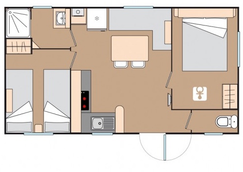 You will enjoy a cozy living area with dining space and a fully equipped kitchen to prepare your meals just like at home. The shower room and separate WC ensure optimal comfort. Outside, the terrace with garden furniture is perfect for meals or relaxing under the camping sun. The Fidji mobile home combines space, functionality, and conviviality for a successful holiday at Royal Camping.
